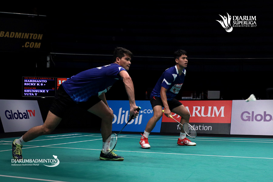 Hardianto/Ricky Karanda Suwardi (PB Mutiara Cardinal) bersiap menghadang serangan.