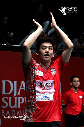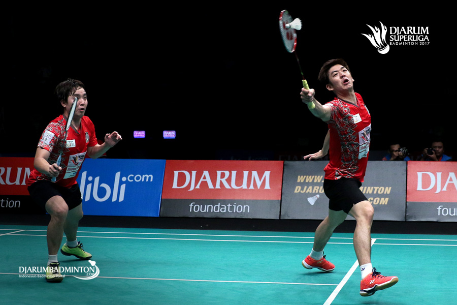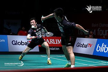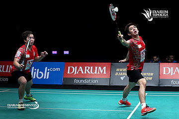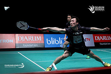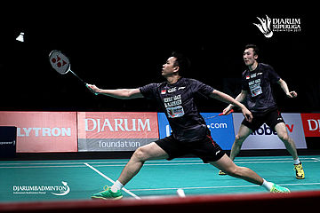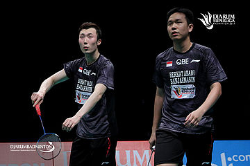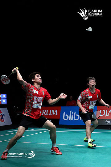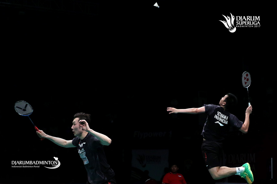 Hendra Setiawan/Yoo Yeon Seong (PB Berkat Abadi) bersiap melepaskan serangan.
