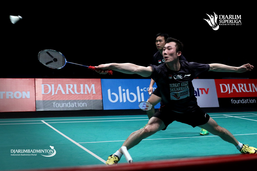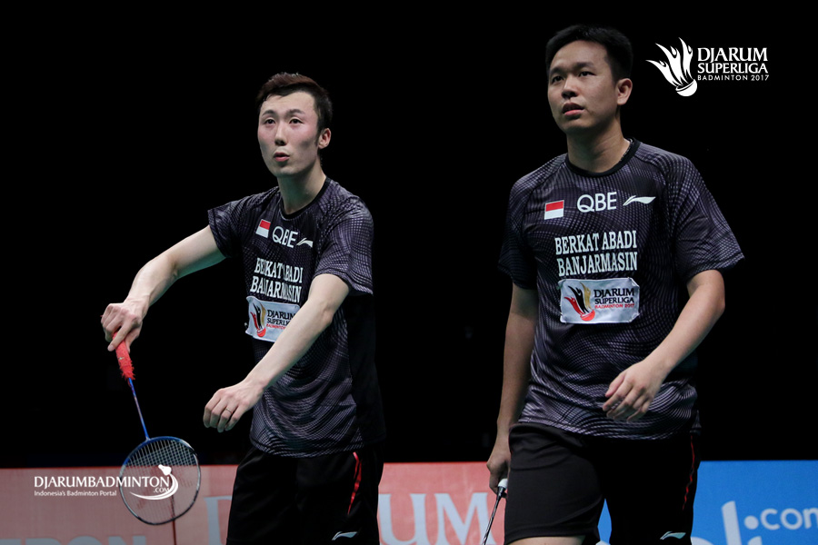 Hendra Setiawan/Yoo Yeon Seong (PB Berkat Abadi) menghadang serangan.