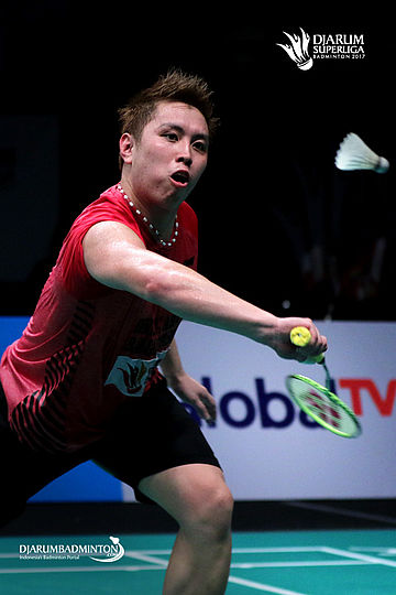Kenichi Tago (PB Berkat Abadi) mengembalikan shuttlecock.