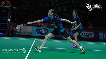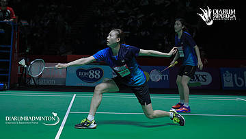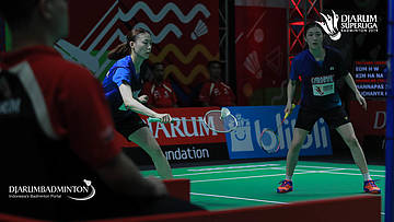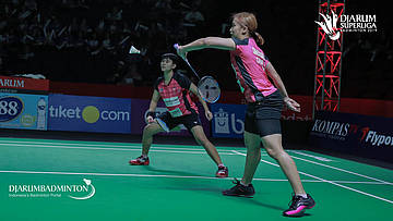 Eom Hye Won/Kim Ha Na (Mutiara Cardinal Bandung) mengembalikan shuttecock