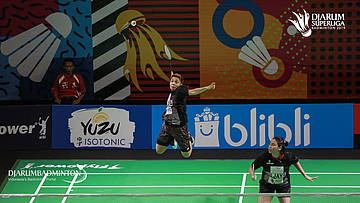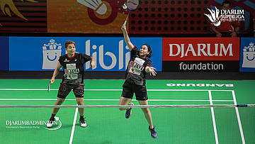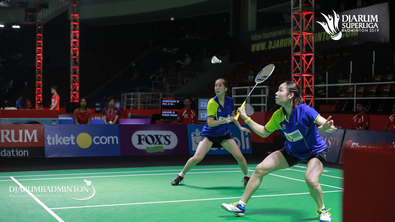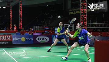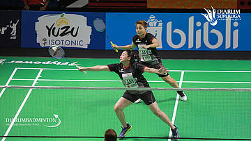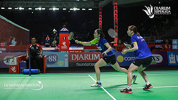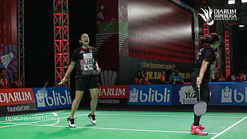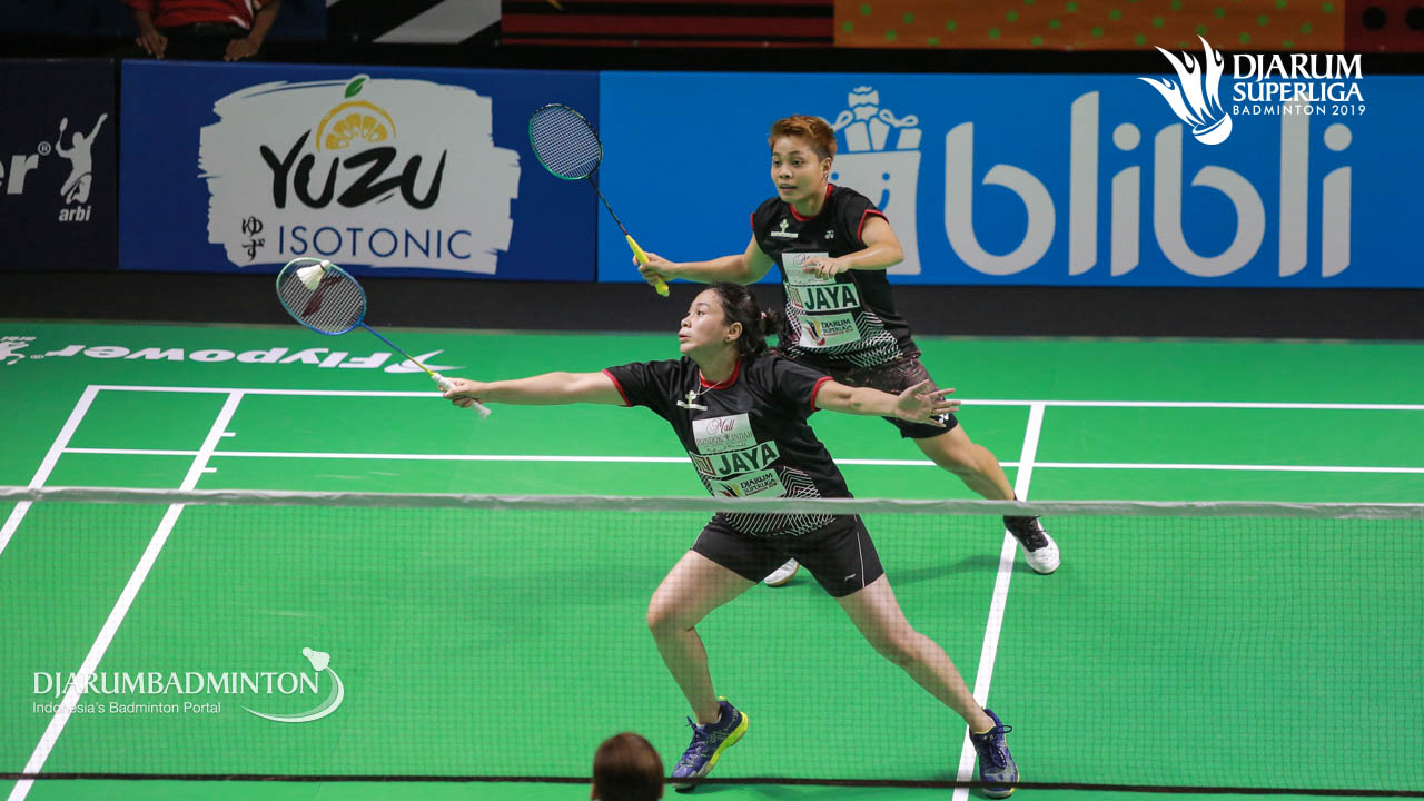Apriyani RAHAYU+Pia Zebadiah BERNADET (JAYA RAYA JAKARTA) bersiap melepaskan serangan