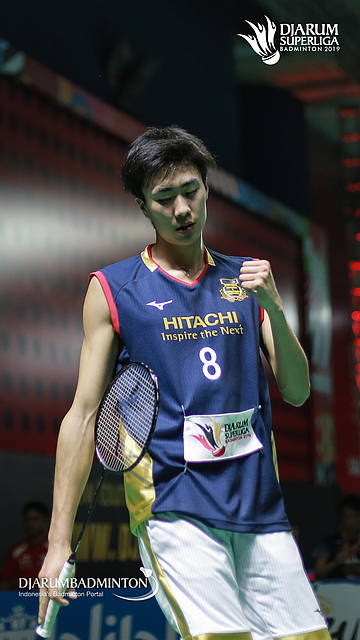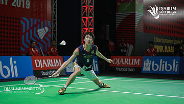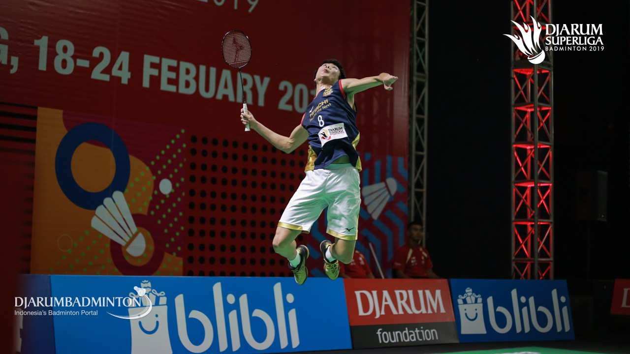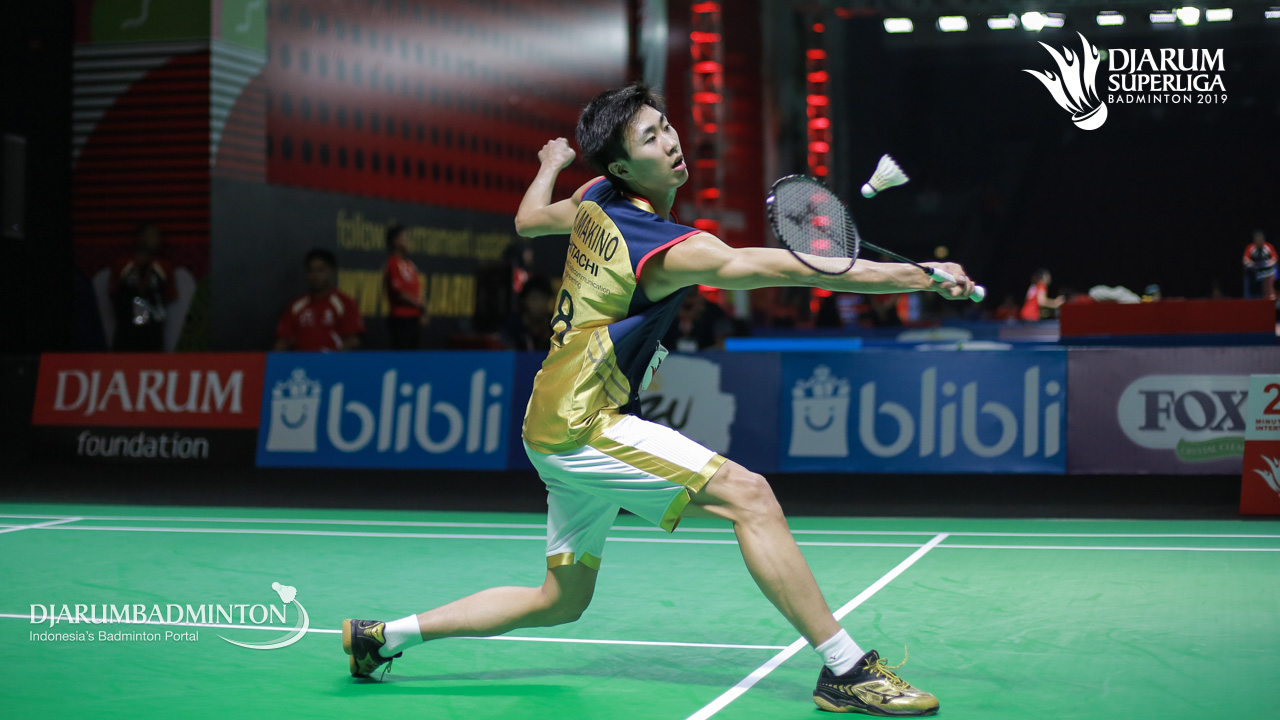 Keita MAKINO (HITACHI) (JAPAN) berusaha menggapai shuttlecock
