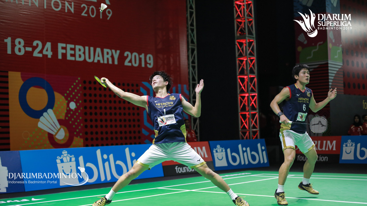 Masato TAKANO+Yoshiki TSUKAMOTO (HITACHI) (JAPAN) bersiap menggapai shuttlecock