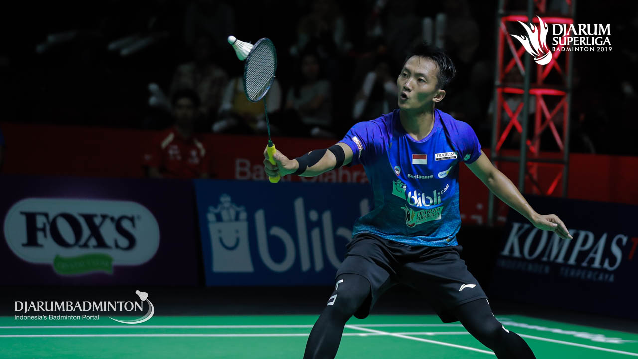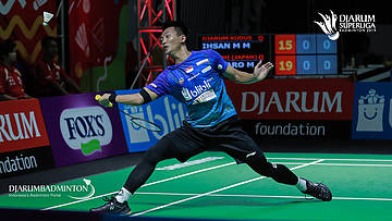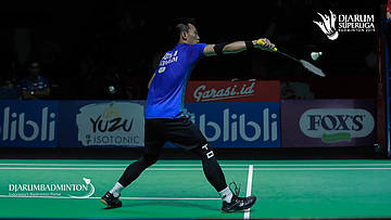Ihsan Maulana Mustofa (Djarum Kudus) mengembalikan shuttlecock