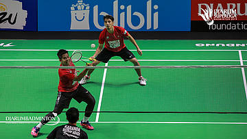 Agripinna Prima Rahmanto PUTRA+Ricky KARANDASUWARDI (BERKAT ABADI) berusaha menggapai shuttlecock