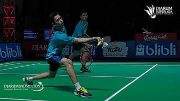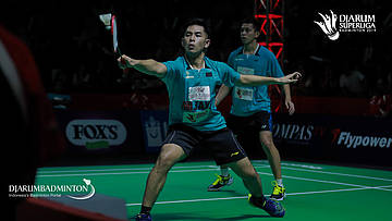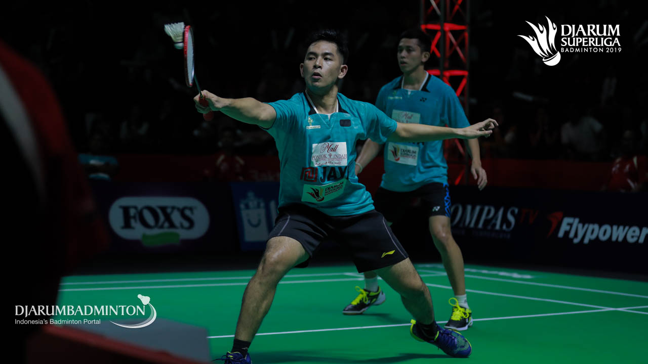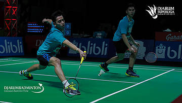 Moh Reza Pahlevi/Muhammad Rian Ardianto (Jaya Raya Jakarta) mengembalikan shuttlecock
