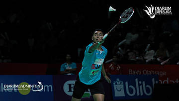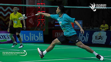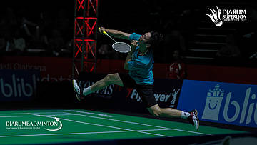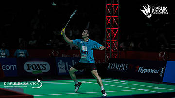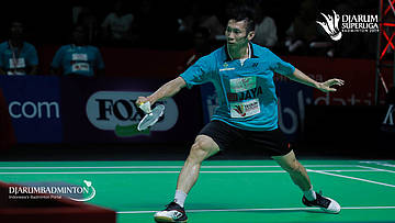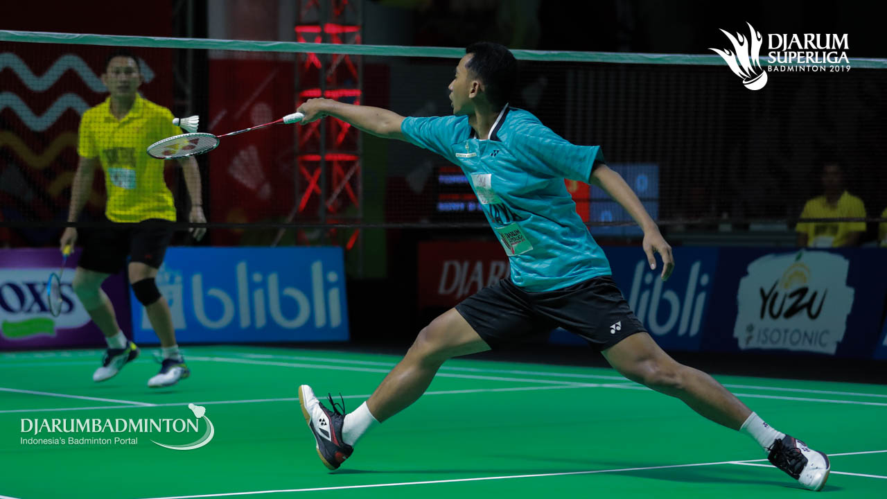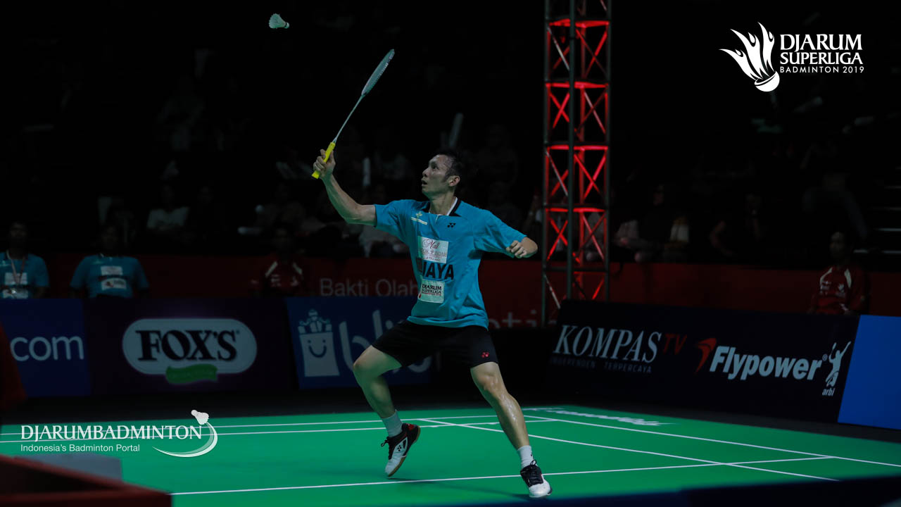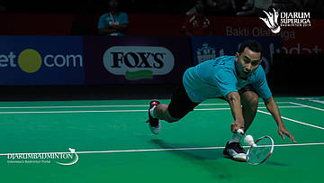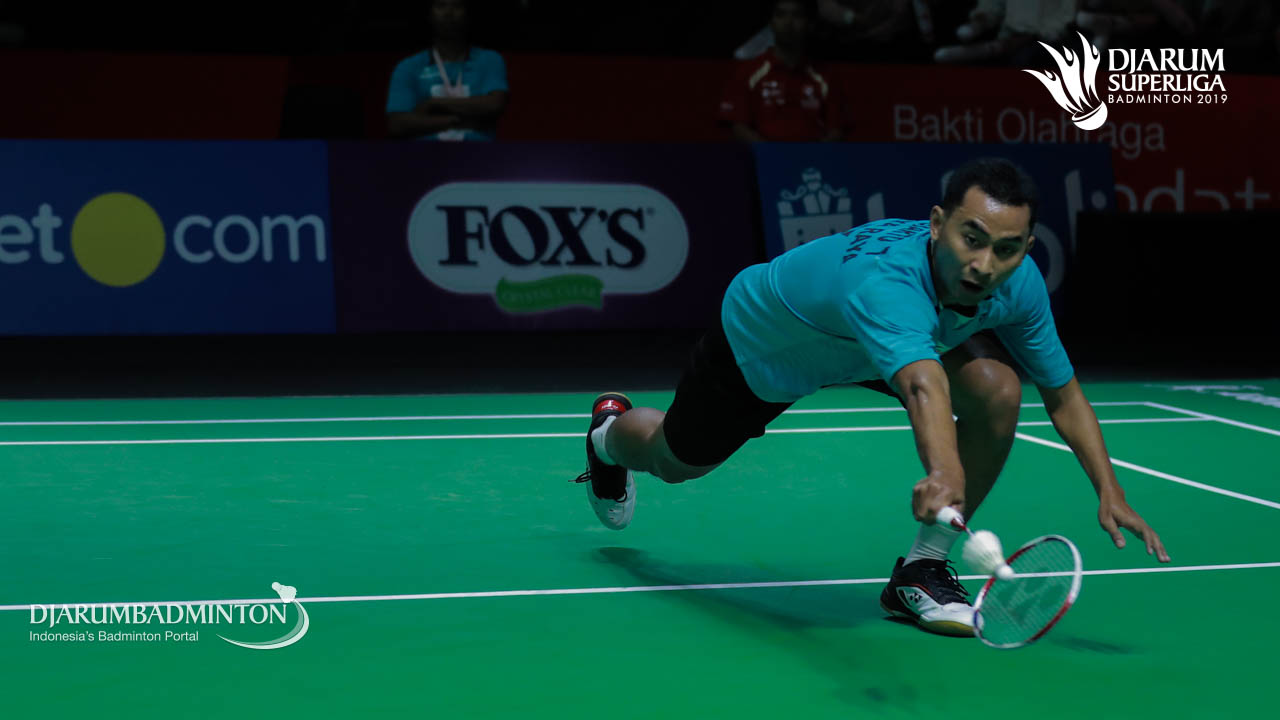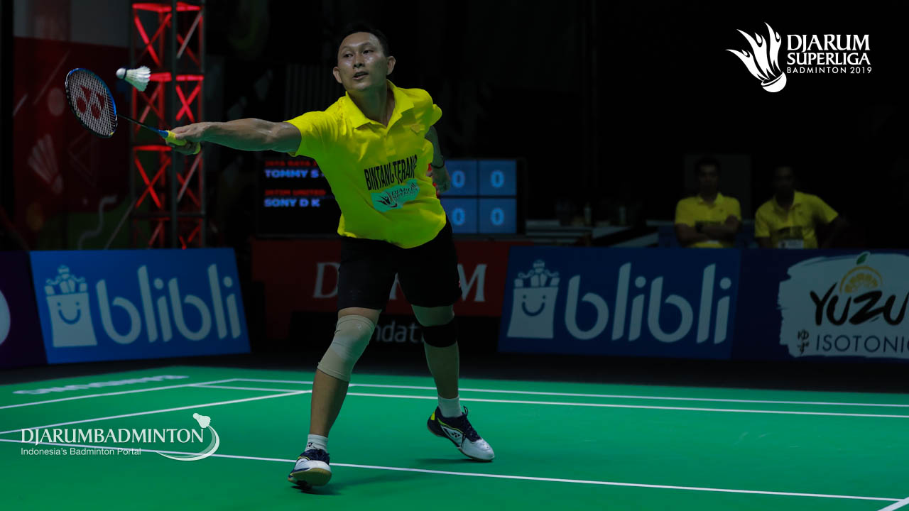 Tommy Sugiarto (Jaya Raya Jakarta) mengembalikan shuttlecock