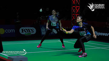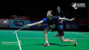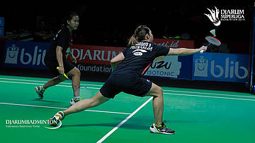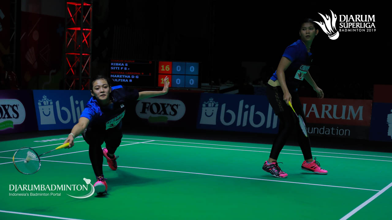 Ribka Sugiarto/Siti Fadia Silva R (Djarum Kudus) mengembalikan shuttlecock