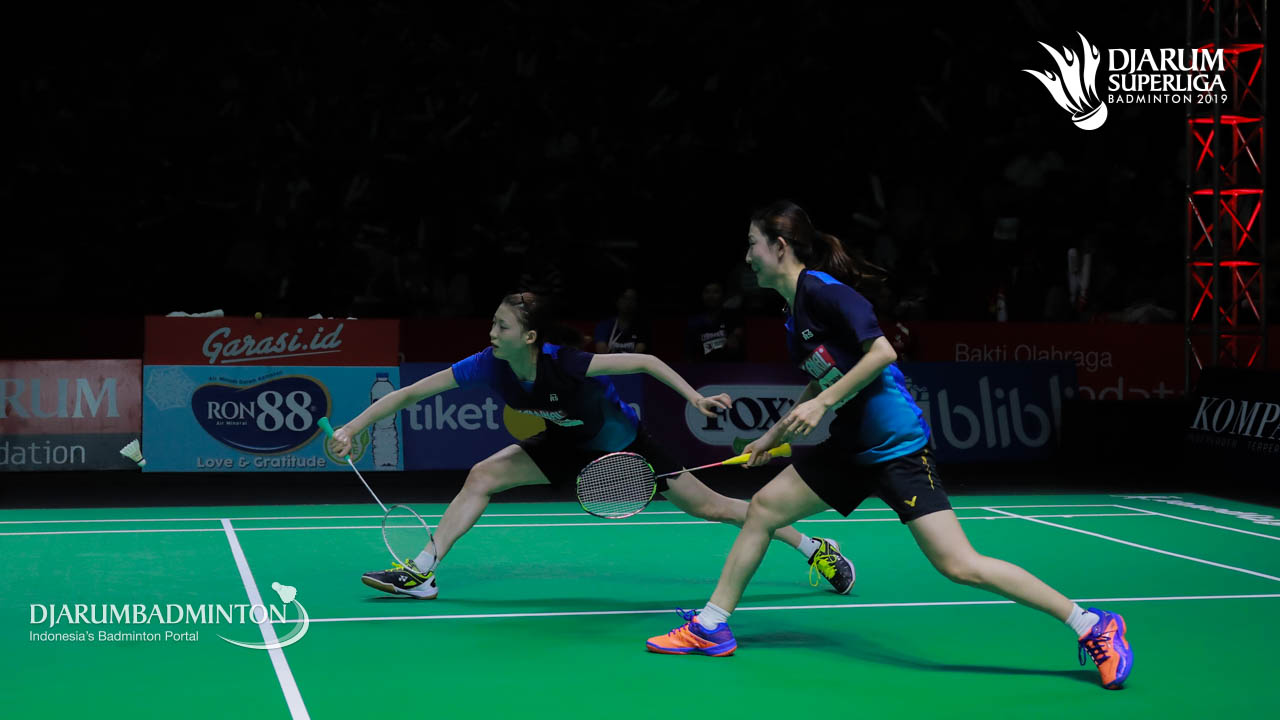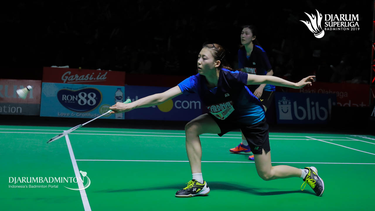 Eom Hye Won/Kim Ha Na (Mutiara Cardinal Bandung) menahan serangan