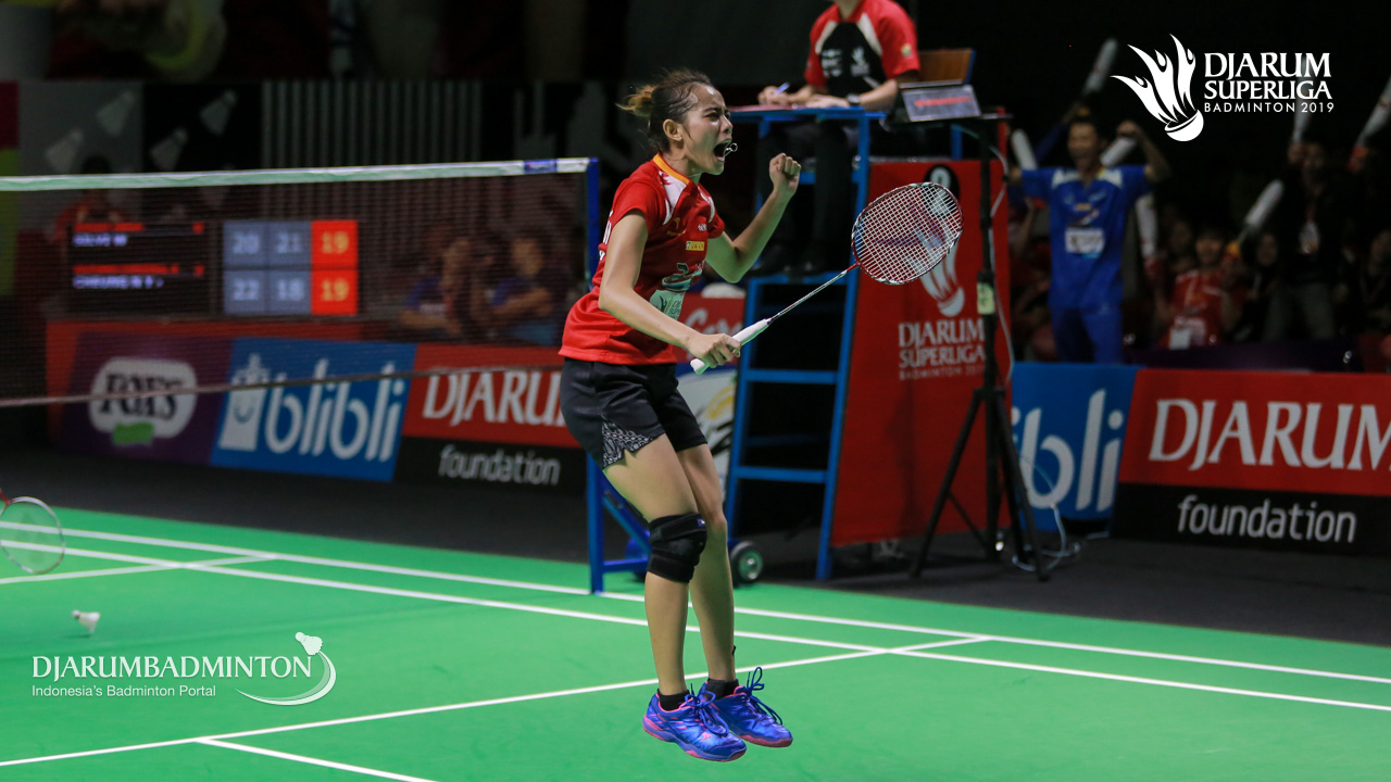 Maretha Dea GIOVANI+Yulfira BARKAH (MUTIARA CARDINAL BANDUNG) berpelukan usai memenangkan pertandingan