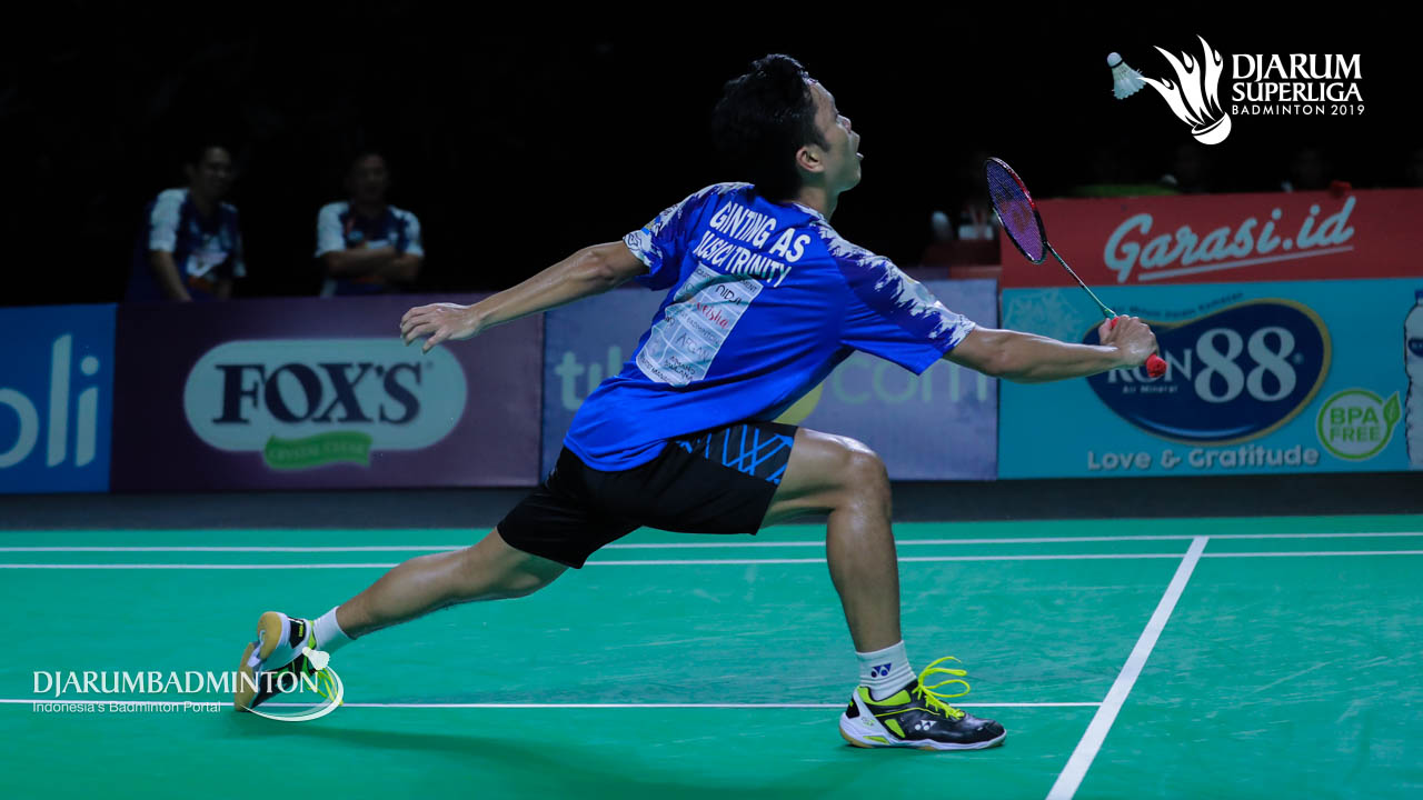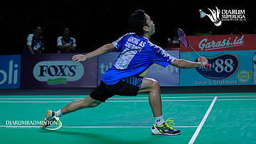 Anthony Sinisuka Ginting (Musica Trinity) mengemballikan shuttlecock