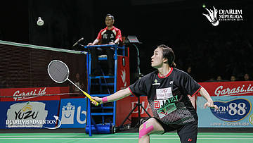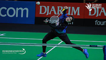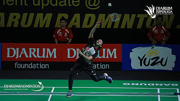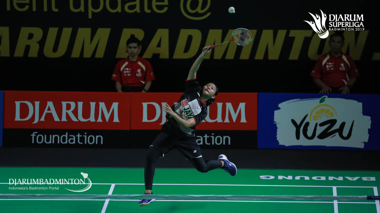 Hanna Ramadini (Mutiara Cardinal Bandung) mengembalikan shuttlecock