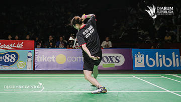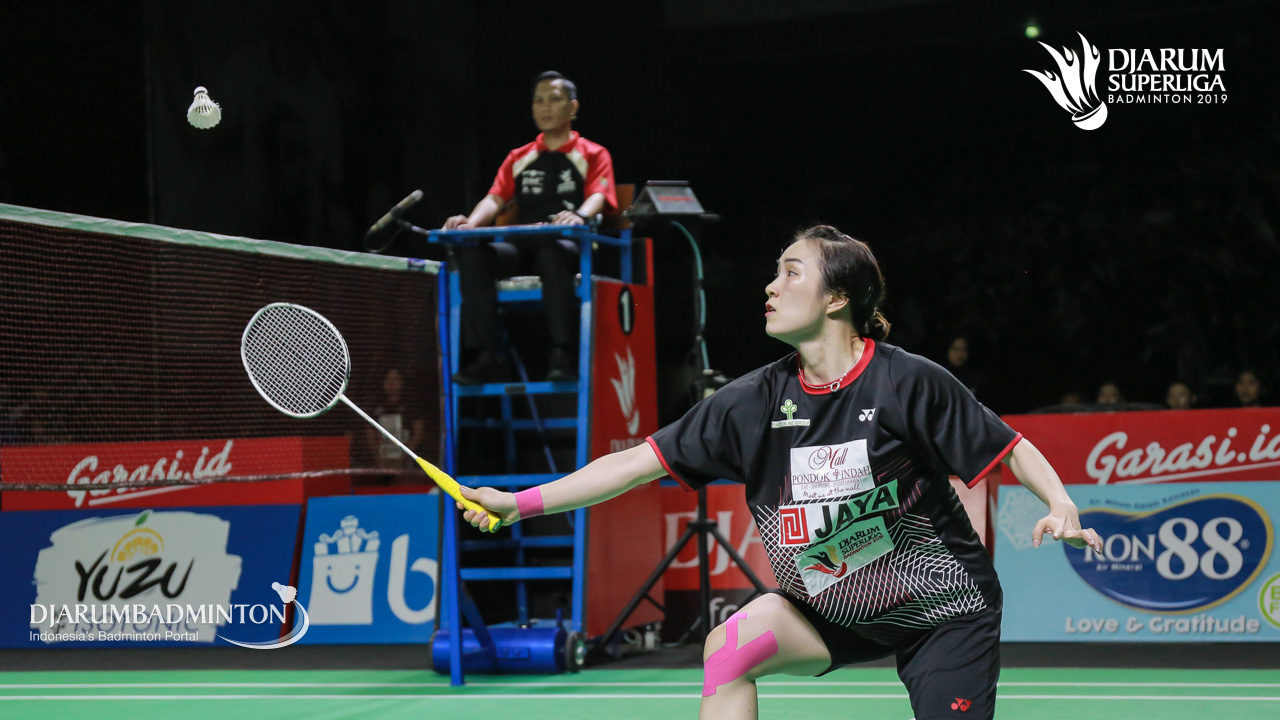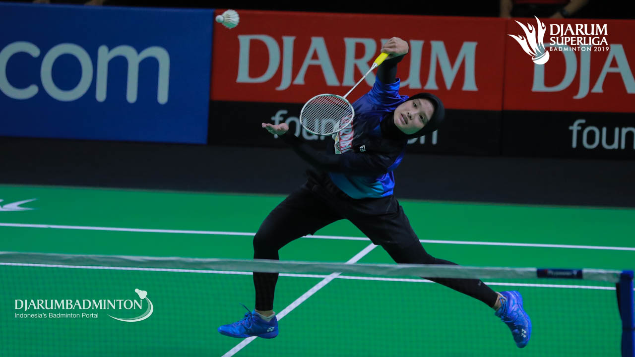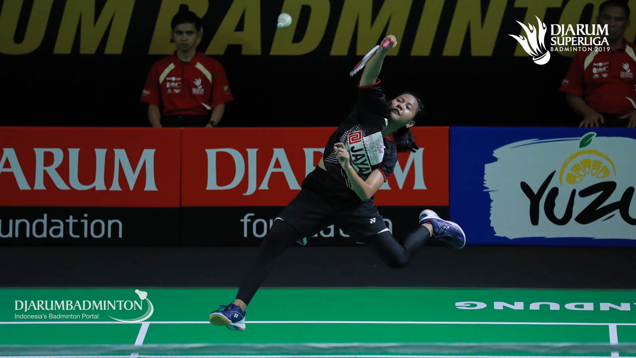 Sri Fatmawati (Jaya Raya Jakarta) melakukan pukulan overhead