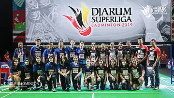 Team Putri MUTIARA CARDINAL BANDUNG dan Team Putri JAYA RAYA JAKARTA berfoto bersama sebelum bertanding