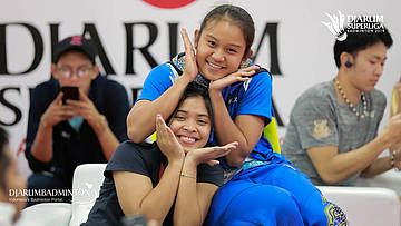 Gregoria Mariska Tunjung dan Aurum Oktavia Winata berpose di Player Lounge
