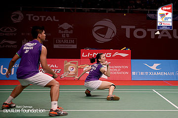Tontowi Ahmad/Liliyana Natsir (INA) berusaha menggapai shuttlecock