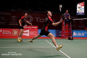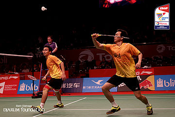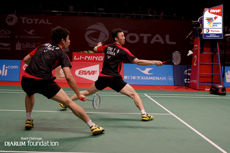 Lee Yong Dae/Yoo Yeon Seong (KOR) mengembalikan shuttlecock ke arah lawan