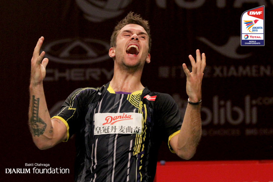 Ekspresi Jan O Jorgensen (DEN) saat memenangkan pertandingan