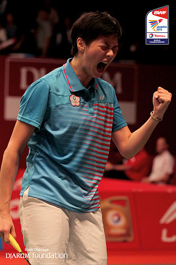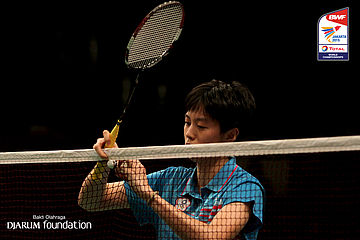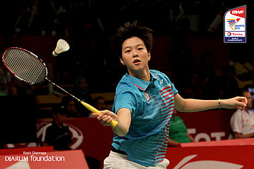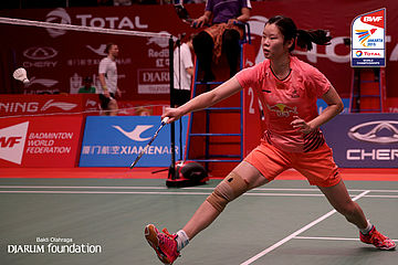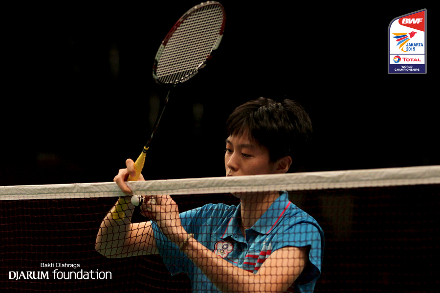 Pai Yu Po (TPE) mengambil shuttlecock yang menyankut di net