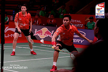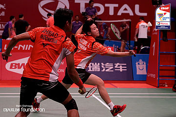 Tontowi Ahmad/Liliyana Natsir (INA) mengembalikan shuttlecock ke arah lawan