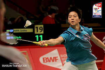 Li Xuerui (CHN) mengembalikan shuttlecock ke arah lawan