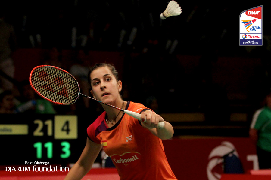 Carolina Marin (ESP) mengembalikan shuttlecock ke arah lawan