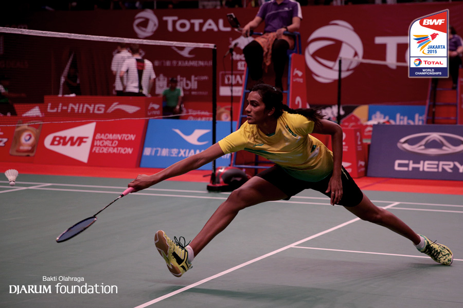 P.V Sindhu (IND) mengembalikan shuttlecock ke arah lawan
