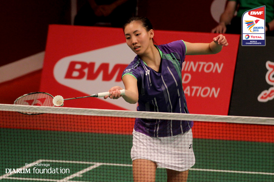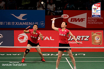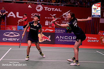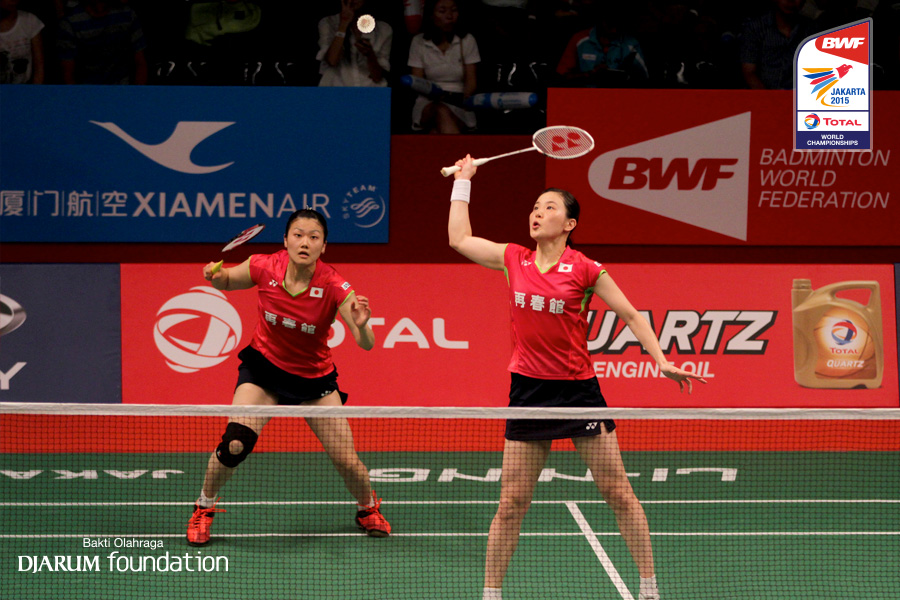 Reika Kakiiwa/Miyuki Maeda (JPN) menahan serangan lawan
