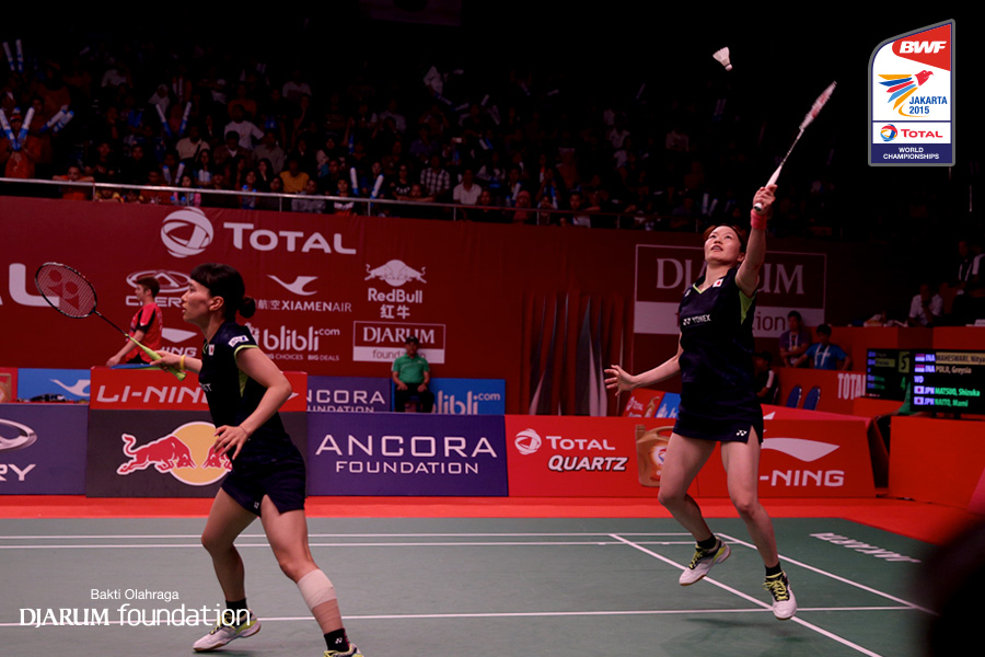 Shizuka Matsuo/Mami Naito (JPN) menahan serangan lawan