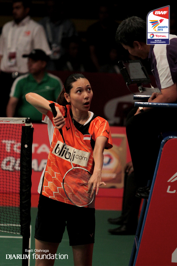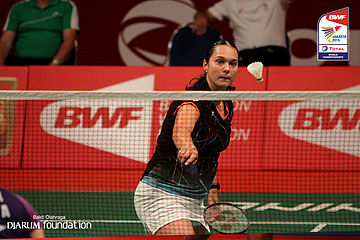 Petya Nedelcheva (BUL) mengembalikan shuttlecock ke arah lawan