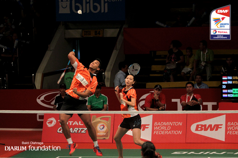Edi Subaktiar/Gloria Emanuelle W (INA) menyambar pengembalian lawan