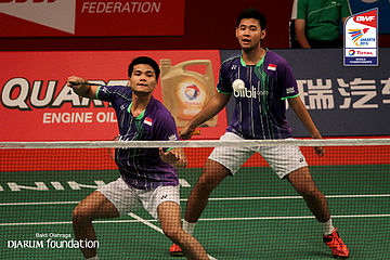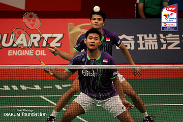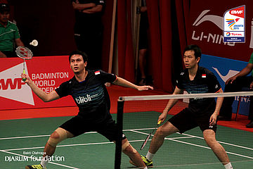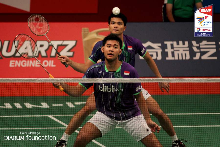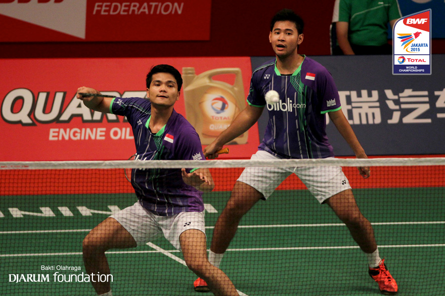Mohammad Ahsan/Hendra Setiawan (INA) menahan serangan lawan