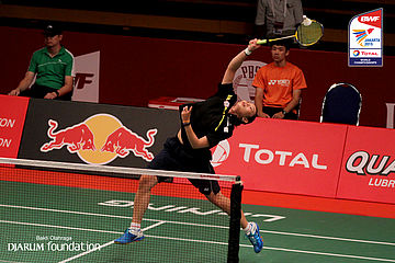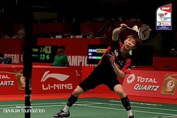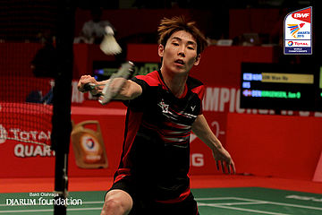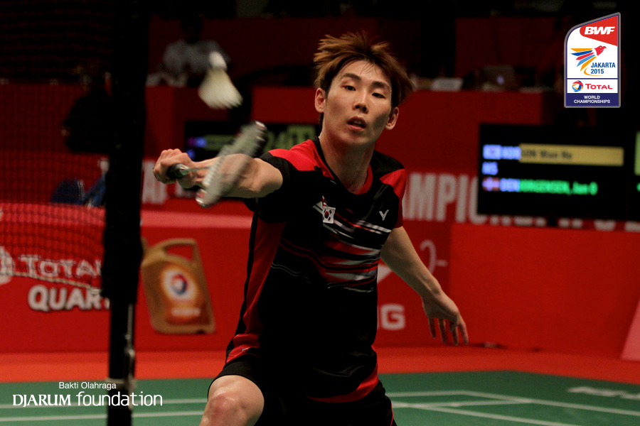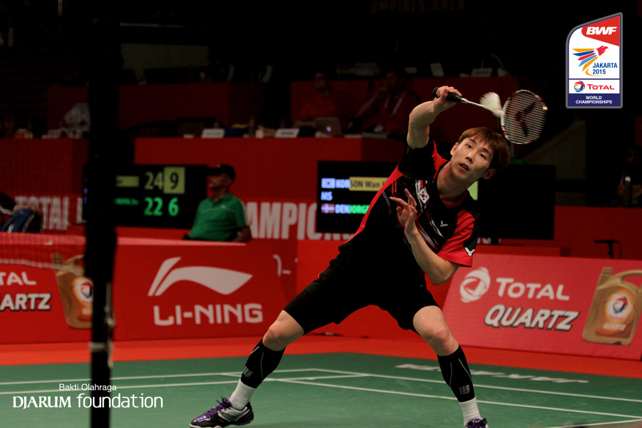 Son Wan Ho (KOR) mengembalikan shuttlecock ke arah lawan