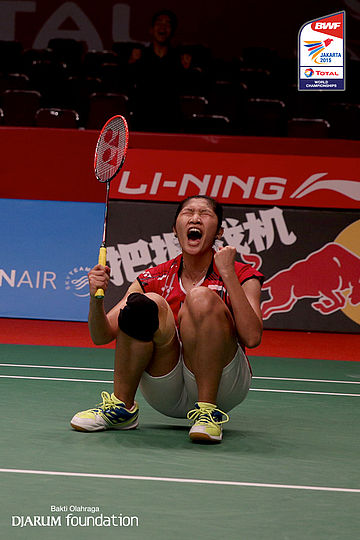 Ekspresi Lindaweni Fanetri (INA) saat memenangkan pertandingan