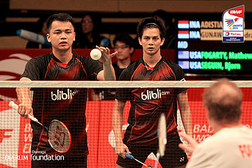 Andrei Adistia/Handra Aprida G (INA) mengembalikan shuttlecock ke arah lawan