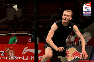 Dieter Domke (GER) berusaha menggapai pengembalian shuttlecock dari Kento Momota (JPN)