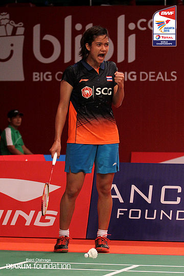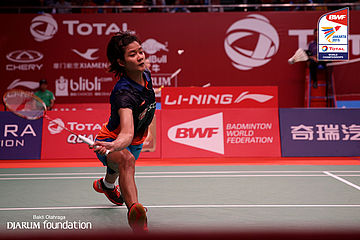 Porntip Buranaprasertsuk (THA) berusaha menggapai shuttlecock