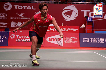 Kento Momota (JPN) bersiap menyambut serve dari Dieter Domke (GER)