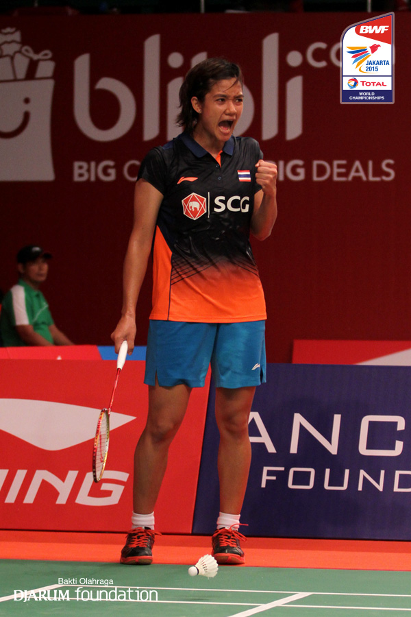Ekspresi Porntip Buranaprasertsuk (THA) saat memenangkan laga pertamanya
