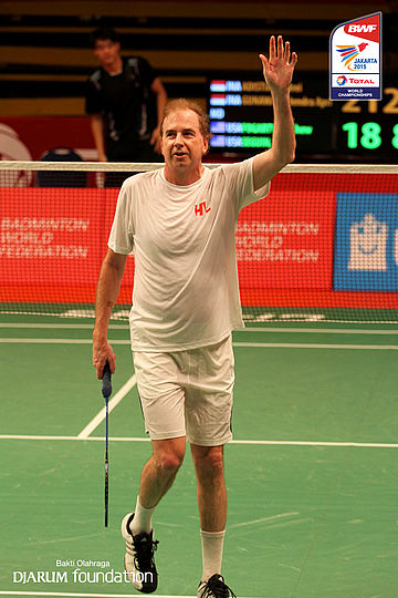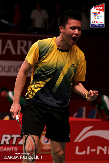 Tommy Sugiarto (INA) berusaha menggapai shuttlecock