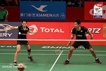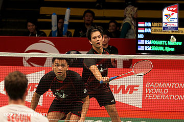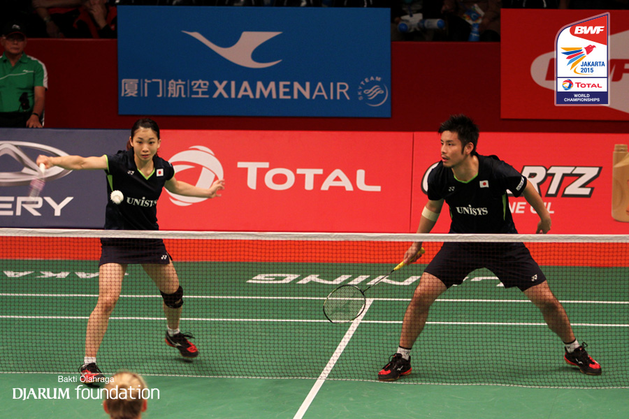 Kenichi Hayakawa/Misaki Matsutomo (JPN) mengembalikan serangan lawan