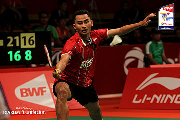 Tommy Sugiarto (INA) mengembalikan shuttlecock ke arah lawan