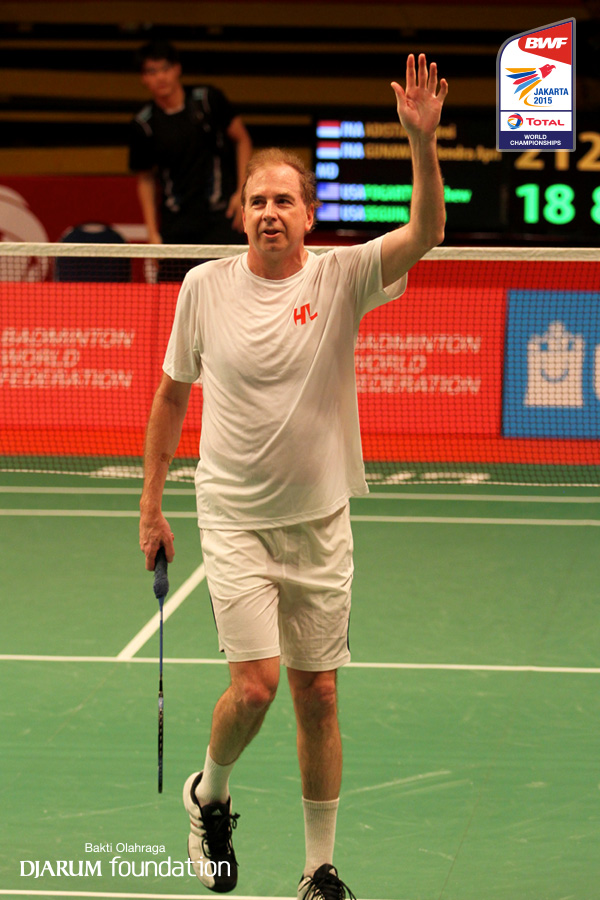 Mathew Fogarty (USA) melambaikan tangan seusai bertanding