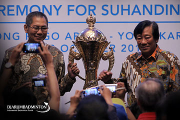Juniarto Suhandinata (Kiri) dan Justian Suhandinata (Kanan) Saat Berfoto Dengan Piala Suhandinata